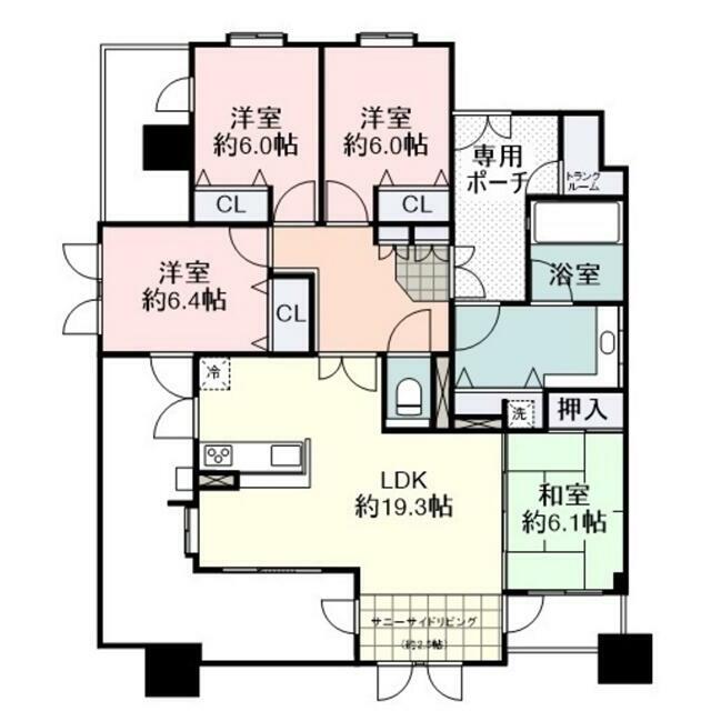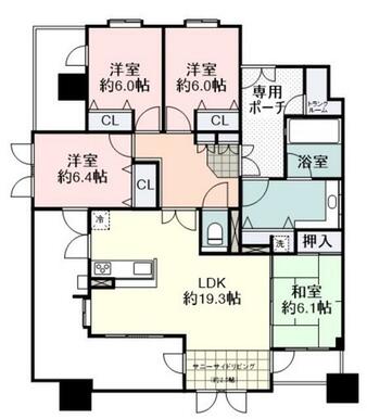 | 間取り(内訳) | 4LDK(1室LDK19.3帖 1室洋6.4帖 1室洋6.0帖 1室和) | ||