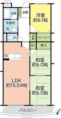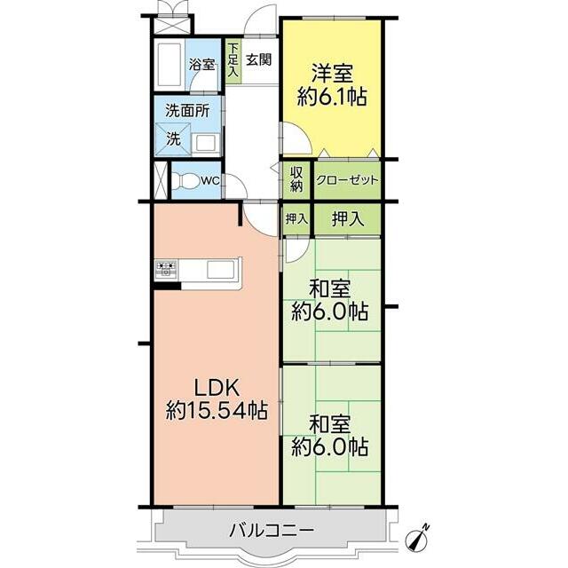 | 間取り(内訳) | 3LDK(1室LDK15.54帖 2室和6帖 1室洋6.1帖) | ||